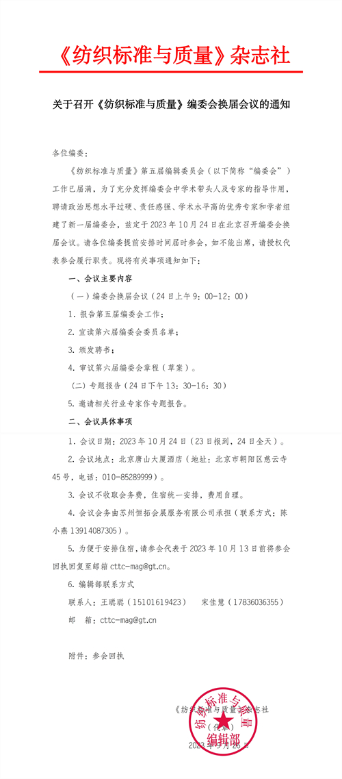 《紡織標(biāo)準(zhǔn)與質(zhì)量》第五屆編輯委員會(以下簡稱“編委會”)工作已屆滿,為了充分發(fā)揮編委會中學(xué)術(shù)帶頭人及專家的指導(dǎo)作用,聘請政治思想水平過硬、責(zé)任感強(qiáng)、學(xué)術(shù)水平高的優(yōu)秀專家和學(xué)者組建了新一屆編委會,茲定于2023年10月24日在北京召開編委會換屆會議。各有關(guān)單位有意參會請按通知報名,具體參會事項及參會回執(zhí)見附件。