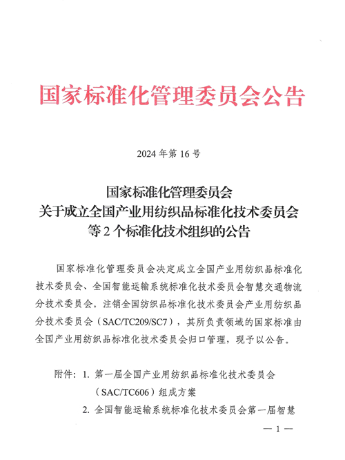 近日,國(guó)家標(biāo)準(zhǔn)化管理委員會(huì)2024年第16號(hào)文發(fā)布公告,決定成立全國(guó)產(chǎn)業(yè)用紡織品標(biāo)準(zhǔn)化技術(shù)委員會(huì),編號(hào)為SAC/TC 606,英文名稱為National Technical Committee 606 on Technical Textiles of Standardization Administration of China,主要負(fù)責(zé)產(chǎn)業(yè)用紡織品基礎(chǔ)通用、實(shí)驗(yàn)方法、產(chǎn)品性能等領(lǐng)域國(guó)家標(biāo)準(zhǔn)制修訂工作。同時(shí)注銷全國(guó)紡織品標(biāo)準(zhǔn)化技術(shù)委員會(huì)產(chǎn)業(yè)用紡織品分技術(shù)委員會(huì)(SAC/TC209/SC7),其所負(fù)責(zé)領(lǐng)域的國(guó)家標(biāo)準(zhǔn)由全國(guó)產(chǎn)業(yè)用紡織品標(biāo)準(zhǔn)化技術(shù)委員會(huì)歸口管理。