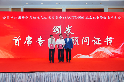同時,為了更廣泛地發(fā)揮各領(lǐng)域?qū)<业淖饔?,更好地開展產(chǎn)業(yè)用紡織品領(lǐng)域標準化工作,第一屆全國產(chǎn)業(yè)用紡織品標委會特聘俞建勇為首席專家,徐路為顧問,19位專家為觀察員,并向首席專家、顧問、委員和觀察員頒發(fā)證書。